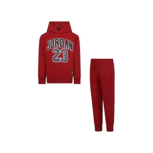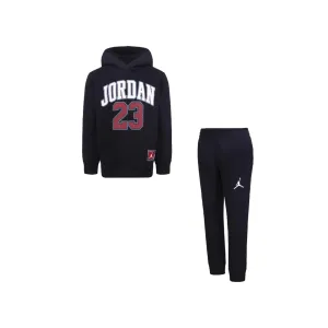 Set coordinato di Jordan composto da felpa pullover e joggers. La felpina con cappuccio fisso sfoggia loghi ricamati al centro del petto ed una label personalizzata; polsini e fondo sono elasticizzati e lavorati a costine. I pantaloni, dotati di elastico in vita regolabile con coulisse interna, sono dotati di polsini alle caviglie ed arricchiti da un mini logo Jumpman stampato sulla sinistra. Struttura in tessuto pesante di 60% cotone e 40% poliestere con interno in caldo pile.
