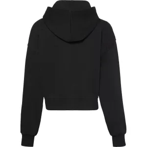 La forma a scatola e le maniche ampie con polsini a sbuffo conferiscono una silhouette moderna e rilassata, mentre la tasca a marsupio unisce praticità e stile. Il logo piccolo sul fondo completa il capo con discrezione ed eleganza.