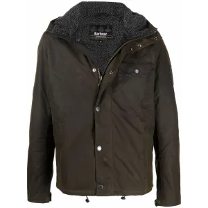 Giacca Barbour wax, realizzata in cotone cerato, finitura impermeabile, interno trapuntato con imbottitura termica, cappuccio e retro foderato in morbido orsetto, tasca sul petto, due tasche a filetto laterali, orlo con coulisse, chiusura frontale con zip e bottoni, logo sulla manica