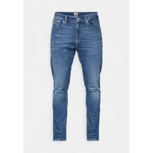Jeans con vestibilità slim tapered, cinque tasche, chiusura frontale con zip e bottone, logo ricamato sulla tasca posteriore destra, salpa logata sul retro