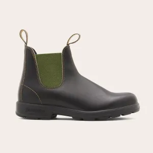Look fashion per lo stivaletto silhouette Chelsea modello Blundstone #519, realizzato in pelle marrone resistente all'acqua con elastici laterali verde oliva. Presentano tomaia liscia con impunture frontali e sul tallone per un tocco ricercato. Linguetta anteriore e posteriore per una calzata facile e suola in gomma dentata antiscivolo. Stivaletti casual chic della serie Originals, per look quotidiani che vi faranno notare per classe e stile.