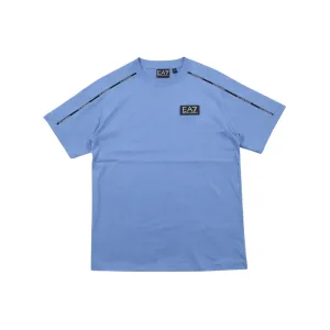 Emporio Armani Junior t-shirt di colore azzurro, banda sottile con logo a contrasto lungo le maniche, modello girocollo, mezza manica, logo gommato sul petto a contrasto, vestibilità regolare. Composizione: 100% cotone