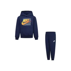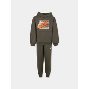 Completo verde in misto cotone felpato, composto da felpa e pantaloni. Felpa a maniche lunghe, con cappuccio, tasca frontale, polsini e orlo a costine. È decorata con stampa logo e iconico swoosh sul davanti. Pantaloni con vita elasticizzata e caviglie a costine. Sono decorati con logo e swoosh, sul davanti.